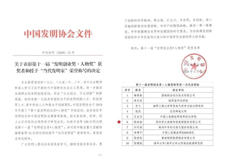 陈林森荣获“发明创业奖•人物奖”特等奖并获“当代发明家”称号
